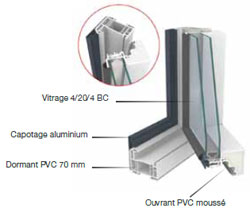 - un dormant PVC de la gamme A80 reconnu pour ses performances thermiques exceptionnelles. D’une largeur de 70 mm, le dormant est revêtu d’un capotage aluminium qui offre une fiabilité dans le temps et une esthétique moderne,