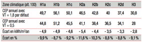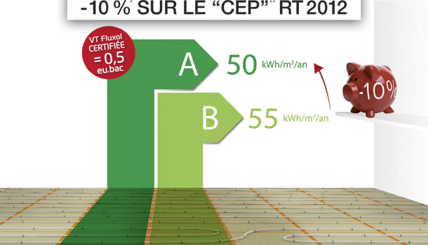 Nicoll a fait réaliser des simulations de l’incidence de ce VT certifié sur le CEP de maisons types. Tous autres critères (isolation, type de chaudière, etc.) inchangés par ailleurs, le seul fait de modifier le VT de 1,8 (valeur par défaut), à 0,5 (valeur certifiée eu.bac pour Fluxol®) permet un gain sur le CEP de 8,7 % à 11,6 % selon les zones climatiques.