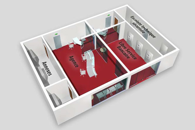 Afin de répondre à des impératifs évidents de sécurité du personnel dans leurs agences, les banques ont entrepris depuis plusieurs années de les rénover. Un nouveau concept a ainsi été mis en place, basé sur un découpage en trois secteurs :