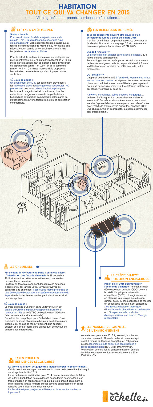 Monechelle.fr nous propose un récapitulatif de tout ce qui va changer pour l'habitat en 2015 : Taxe d'aménagement, installation de détecteurs, cheminées, résidences secondaires, Grenelle de l'environnement et économies d'énergie.