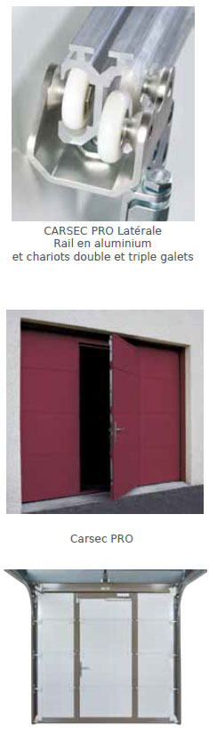 Grâce un cheminement des câbles optimisé et des ressorts repositionnés pour garantir une manoeuvre toute en discrétion, la CARSEC PRO se distingue par son fonctionnement ultra-silencieux. La faible retombée de linteau de seulement 115 mm en standard permet dans le cas d’une installation en version motorisée de conserver les avantages des ressorts de traction dans les montants. Courbes de rail en aluminium et acier, panneau haut doté d’un renfort acier systématique, pieds d’huisserie en acier inoxydable surélevée de 5 mm, fixation par équerres acier 15/1Oème, charnière et supports de roulettes renforcées, sont autant d’atouts techniques au service d’une robustesse et d’une durabilité sans compromis. Pratique, la porte CARSEC PRO est disponible en option avec un portillon intégré breveté.