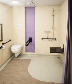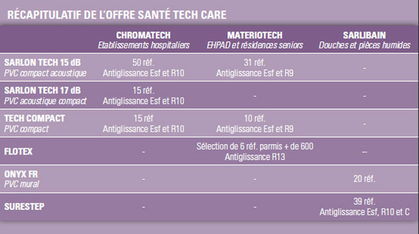 La solution Tech care est composée de 3 gammes complémentaires, Chromatech, Materiotech et Sarlibain, qui permettent de combiner sols et murs des différents espaces (chambres, douches, circulations) pour assurer à la fois un résultat esthétique et performant.